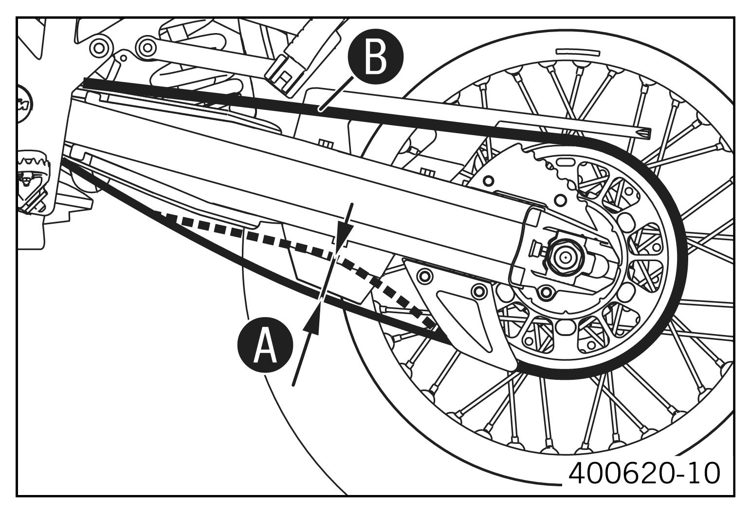 - Gently push the chain upward until it’s taut — the upper edge of the lower section of the chain should line up between the 35mm and 40mm marks to be within KTM spec.